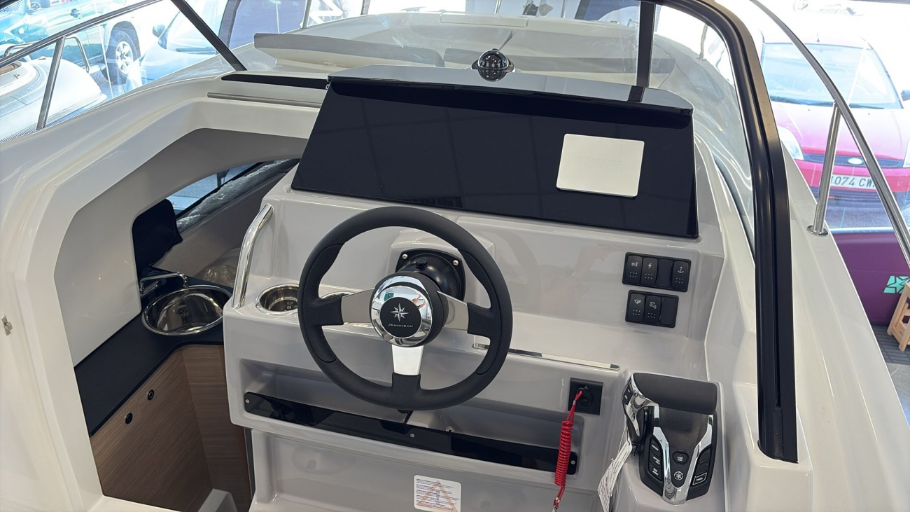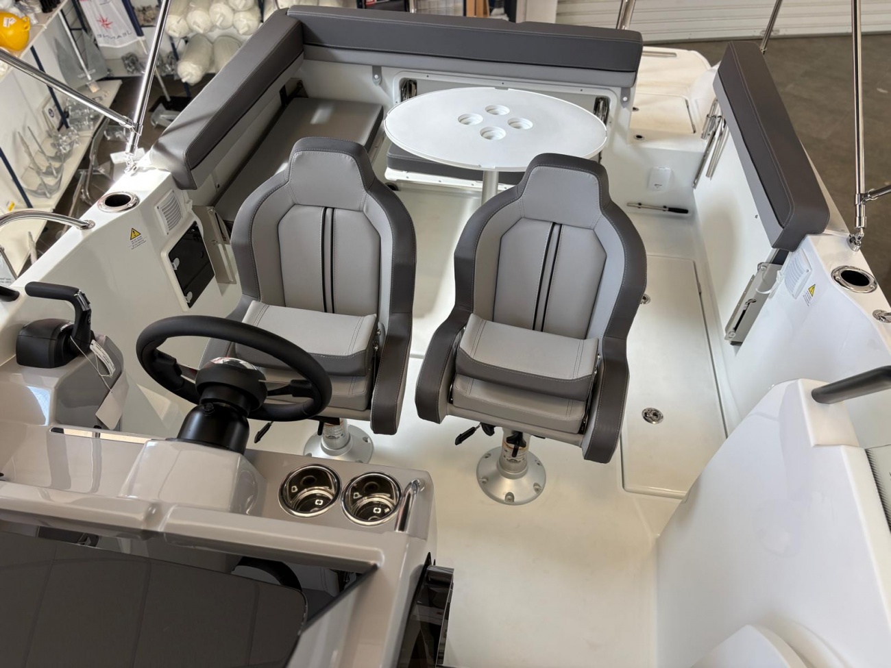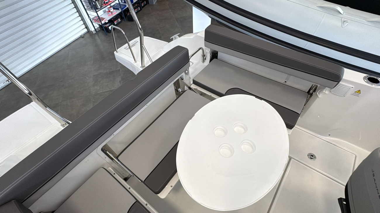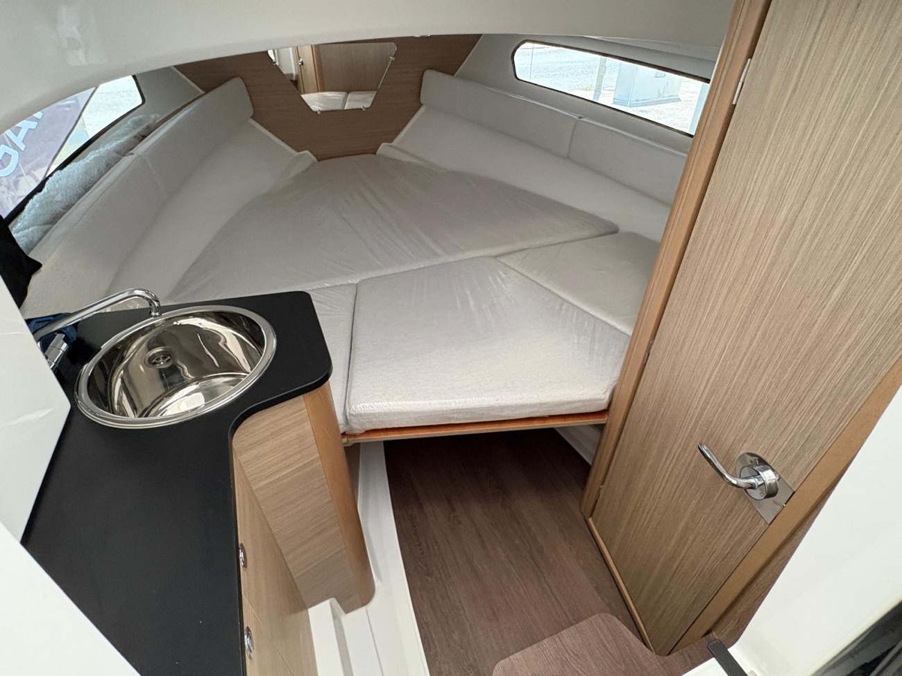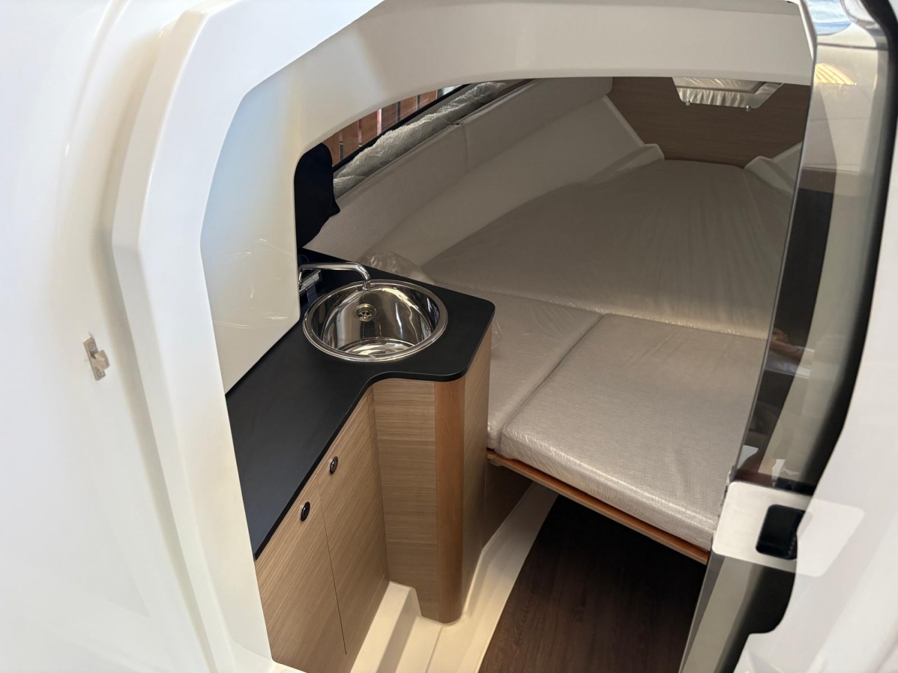 Con su casco en V profundo y estable, responde muy bien a cualquier condición de navegación. Tiene una línea moderna, una proa espaciosa con solárium y una bañera pensada para relajarse, pescar o compartir un buen picoteo al atardecer.