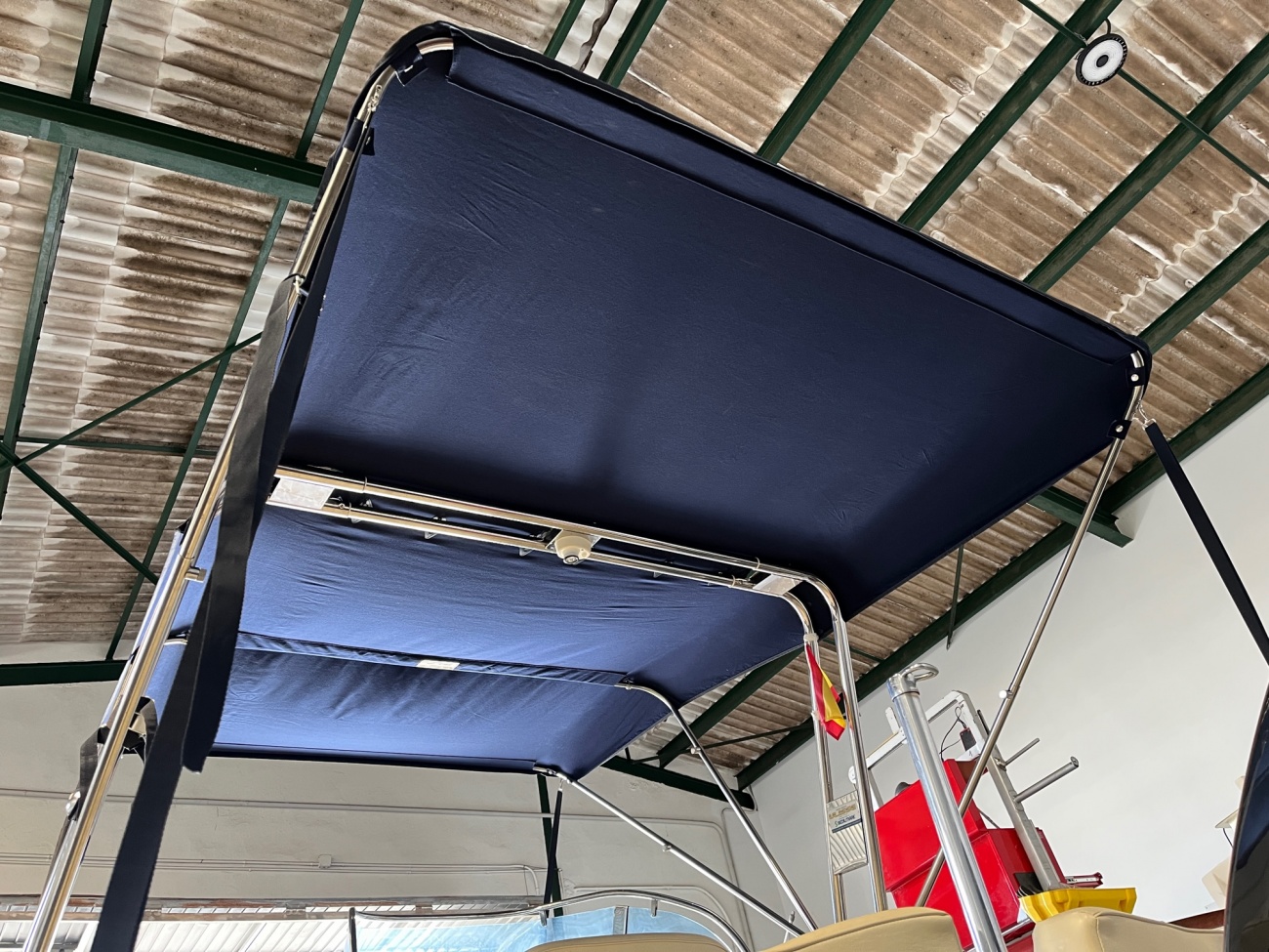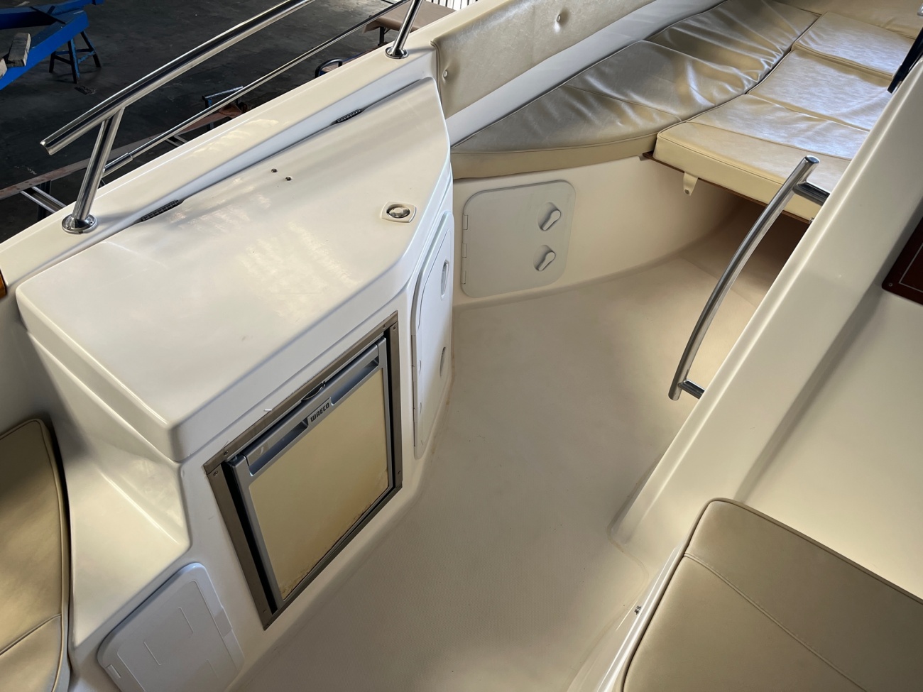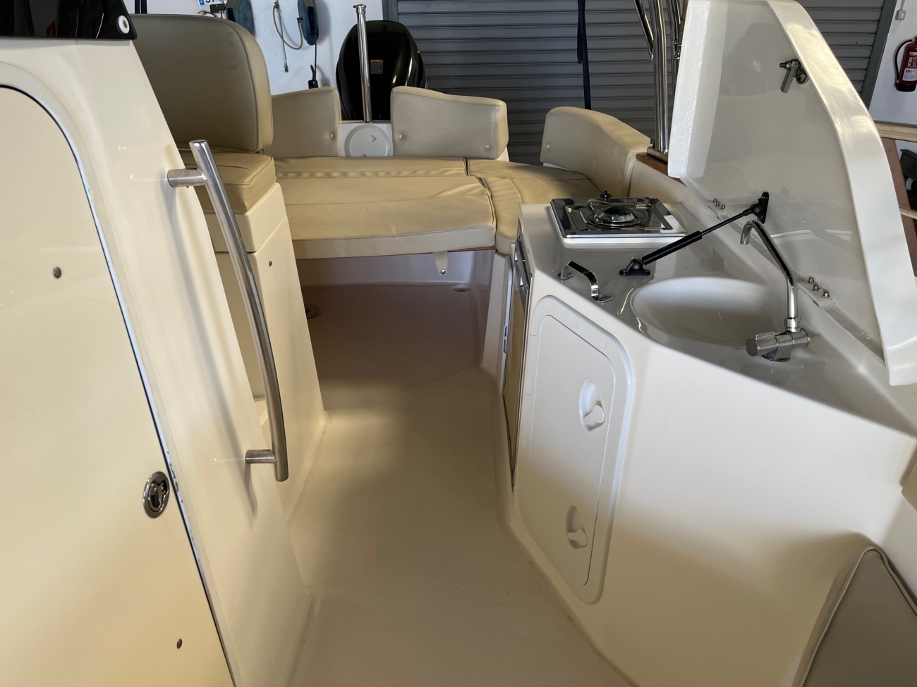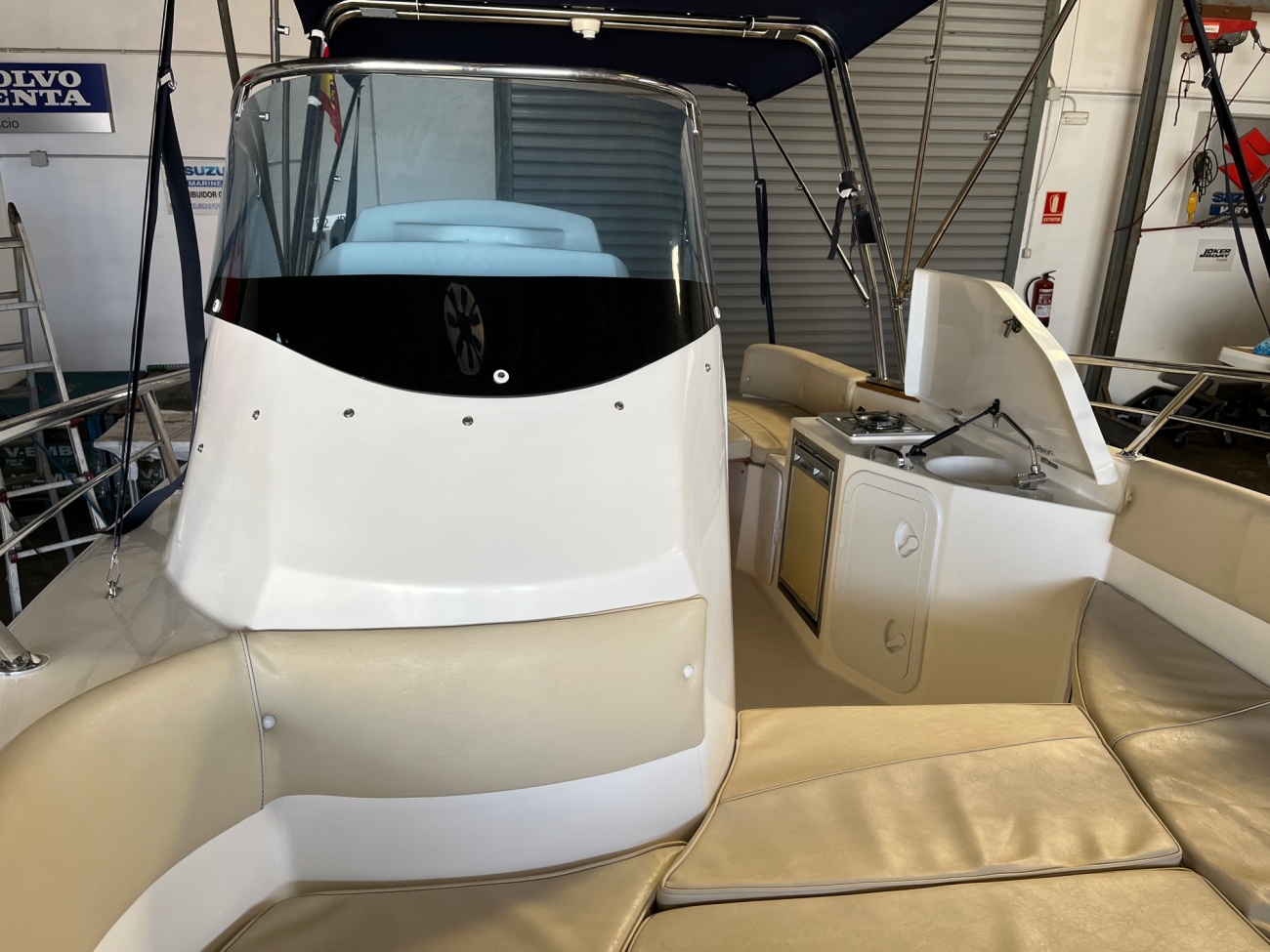 Embarcación en muy buen estado, con una distribución ideal para las salidas diarias, con varios espacios para el relax, zona de comedor convertible en solarium, además de un mueble auxiliar con cocina y nevera exterior que aumenta el confort y la versatilidad a bordo. Cuenta también con un WC muy conveniente, así como un buen equipamiento. Colchonetas completas, comedor popa convertible en solarium, gran toldo parasol inox, mueble con cocina y nevera eléctrica, fregadero, varios cofres estiba, mástil ski, mesa.