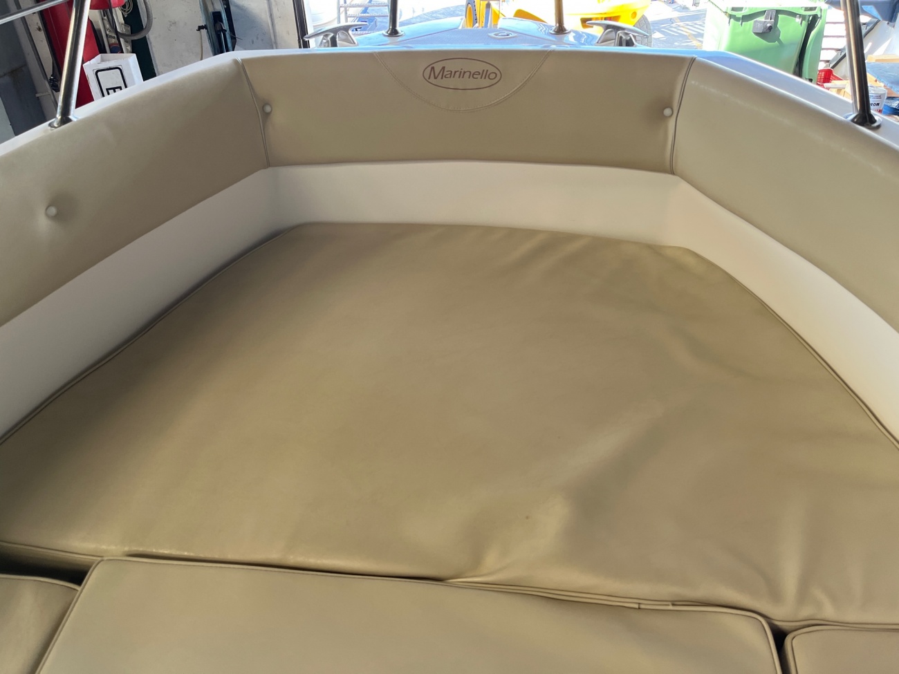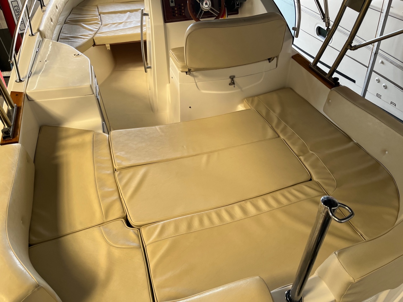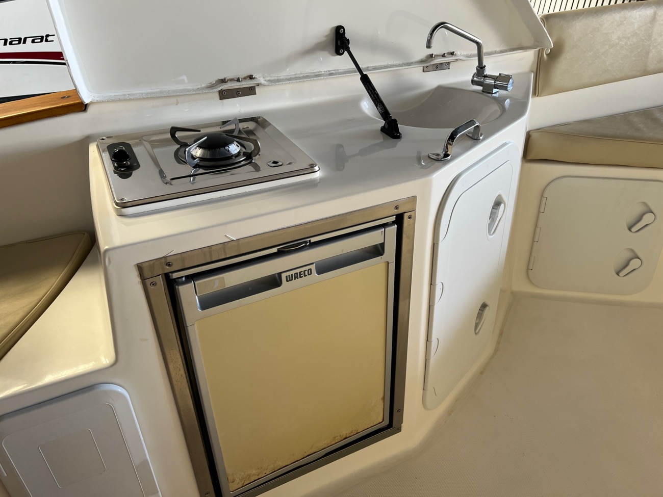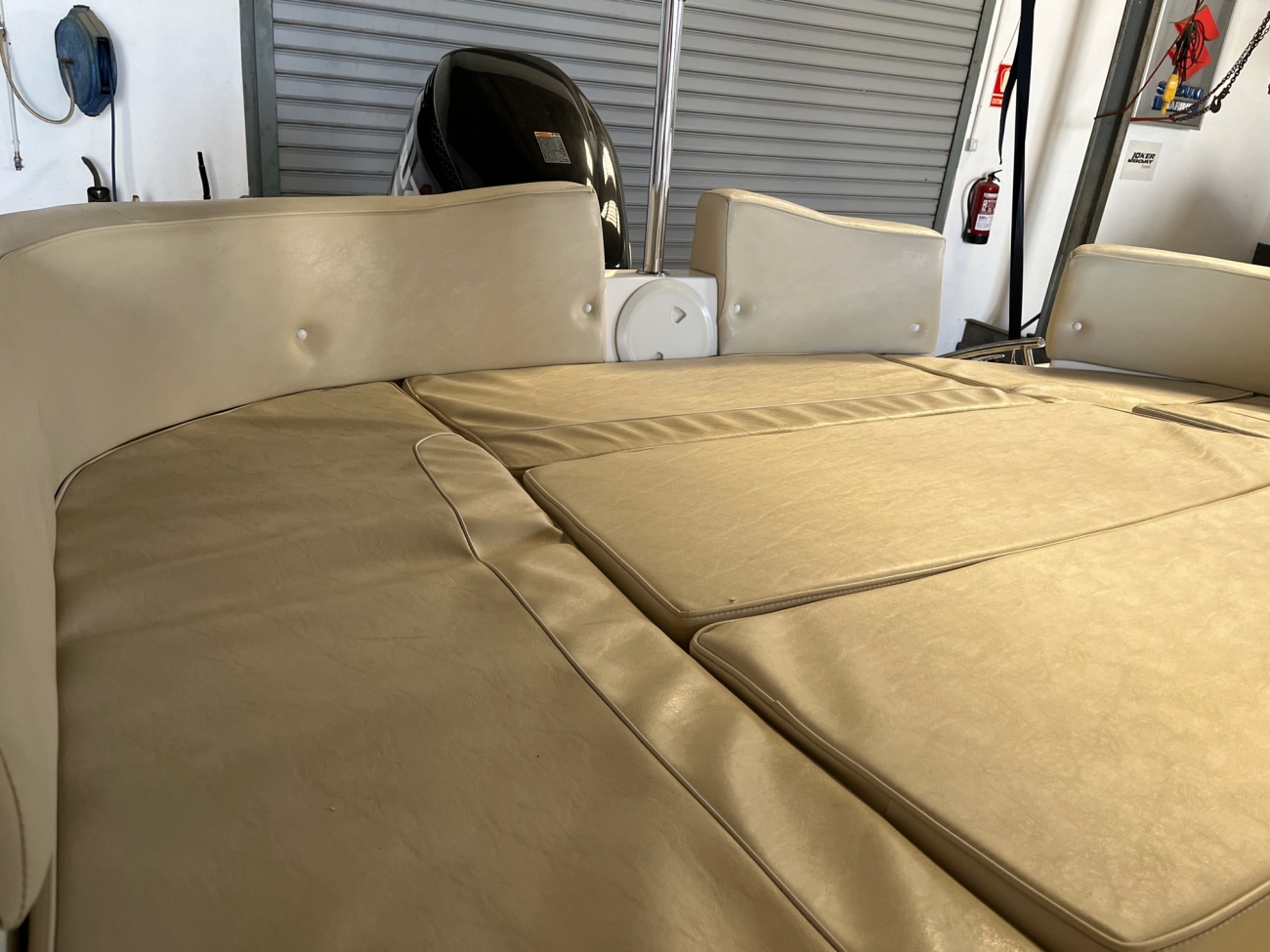 Embarcación en muy buen estado, con una distribución ideal para las salidas diarias, con varios espacios para el relax, zona de comedor convertible en solarium, además de un mueble auxiliar con cocina y nevera exterior que aumenta el confort y la versatilidad a bordo. Cuenta también con un WC muy conveniente, así como un buen equipamiento. Colchonetas completas, comedor popa convertible en solarium, gran toldo parasol inox, mueble con cocina y nevera eléctrica, fregadero, varios cofres estiba, mástil ski, mesa.