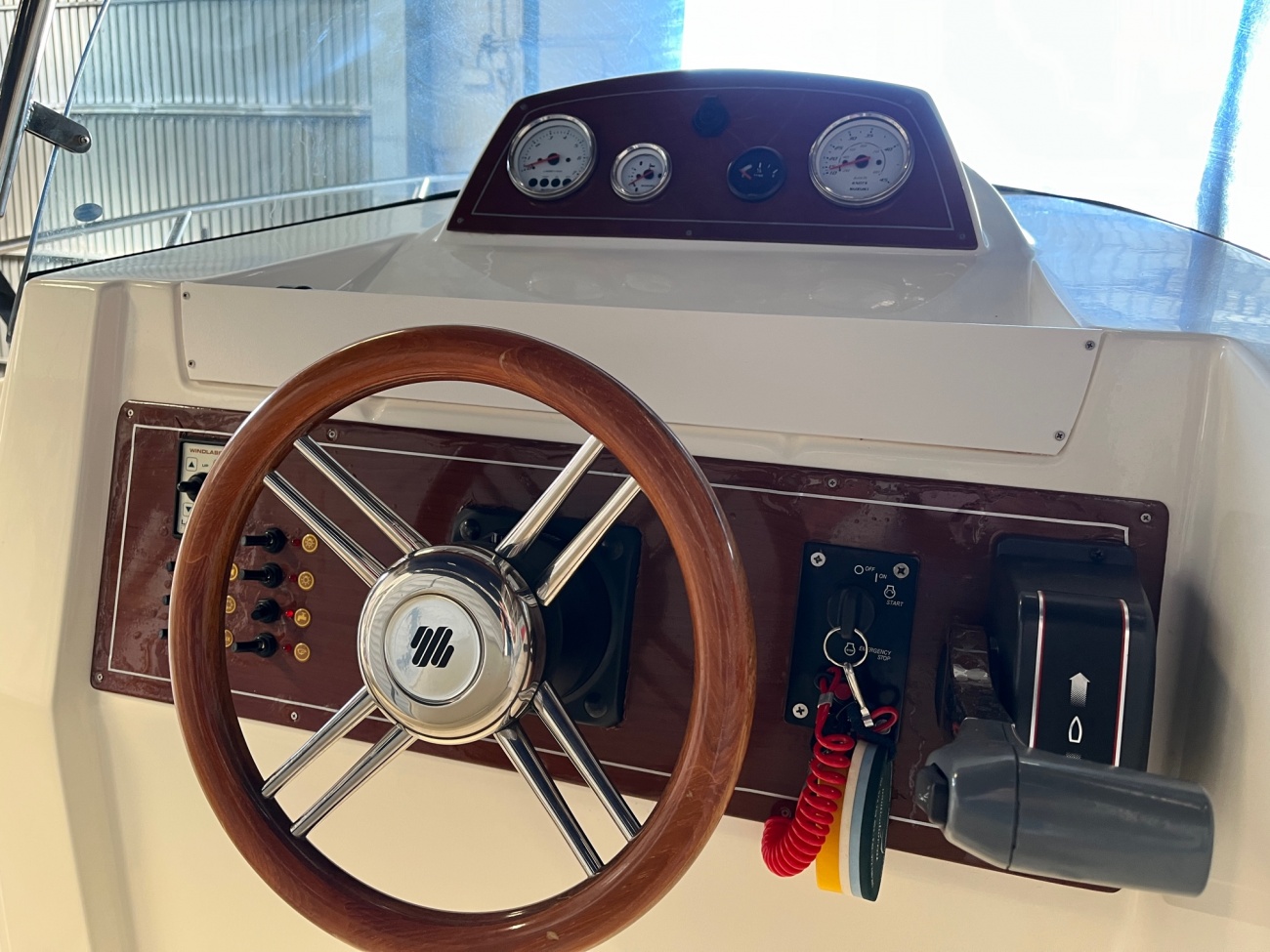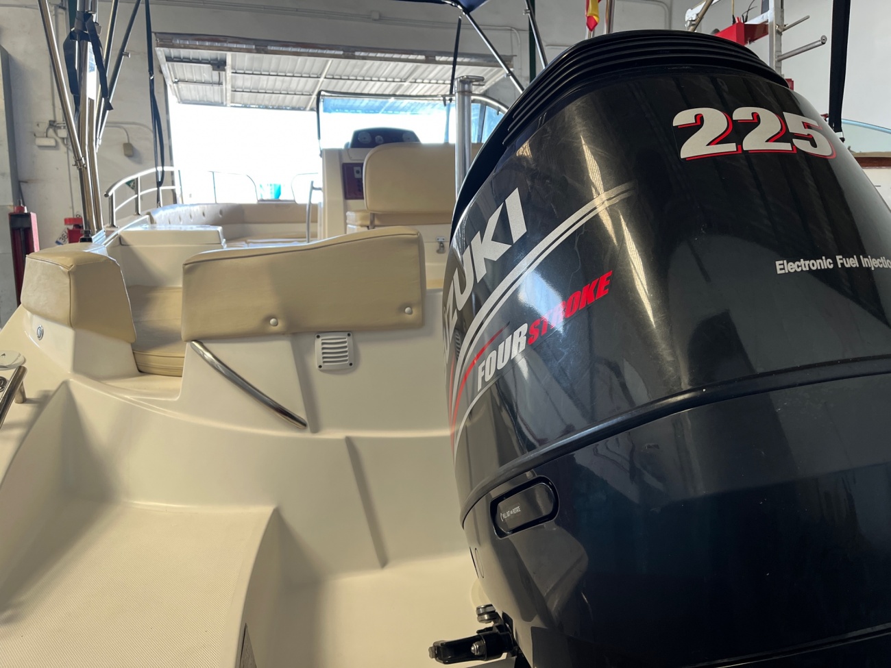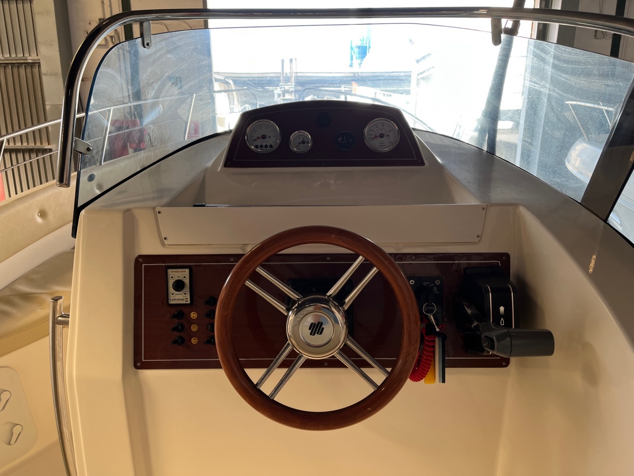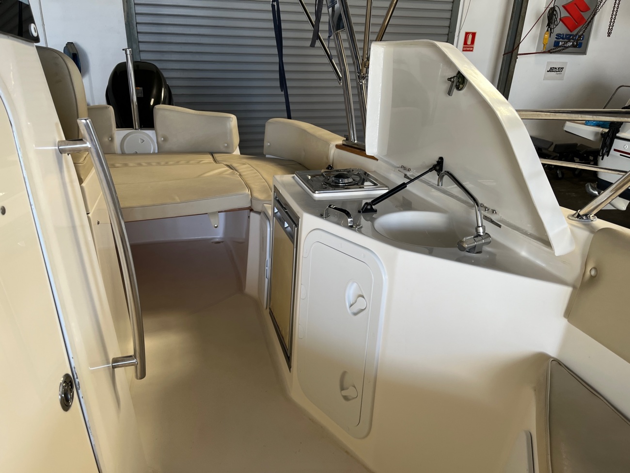 Embarcación en muy buen estado, con una distribución ideal para las salidas diarias, con varios espacios para el relax, zona de comedor convertible en solarium, además de un mueble auxiliar con cocina y nevera exterior que aumenta el confort y la versatilidad a bordo. Cuenta también con un WC muy conveniente, así como un buen equipamiento. Colchonetas completas, comedor popa convertible en solarium, gran toldo parasol inox, mueble con cocina y nevera eléctrica, fregadero, varios cofres estiba, mástil ski, mesa.