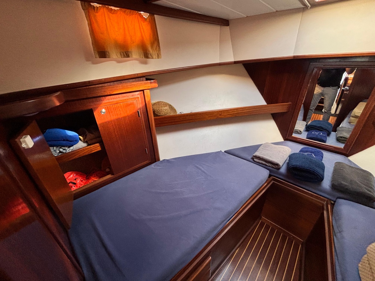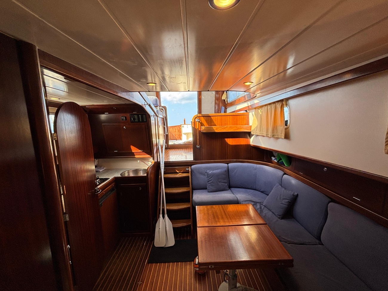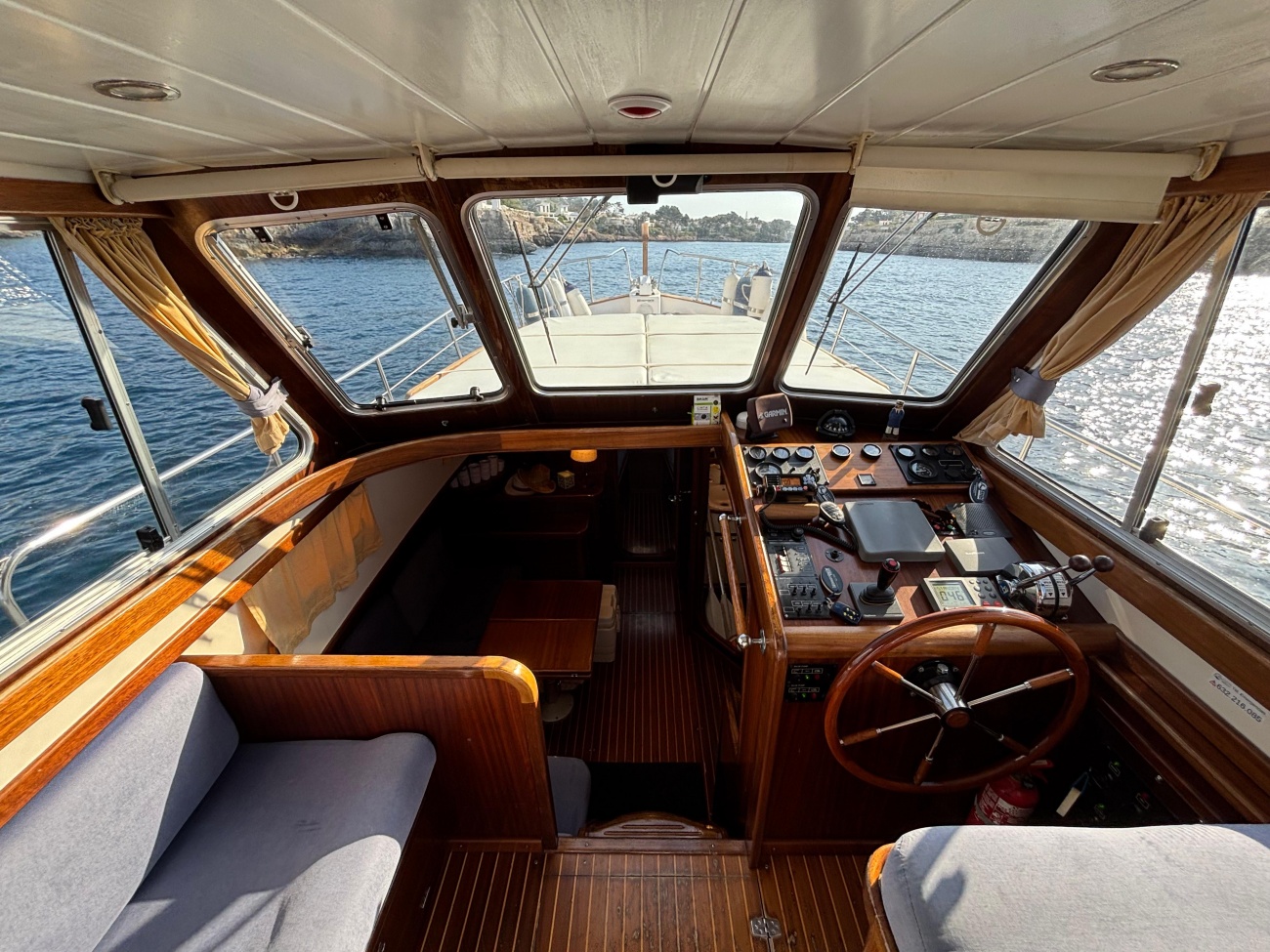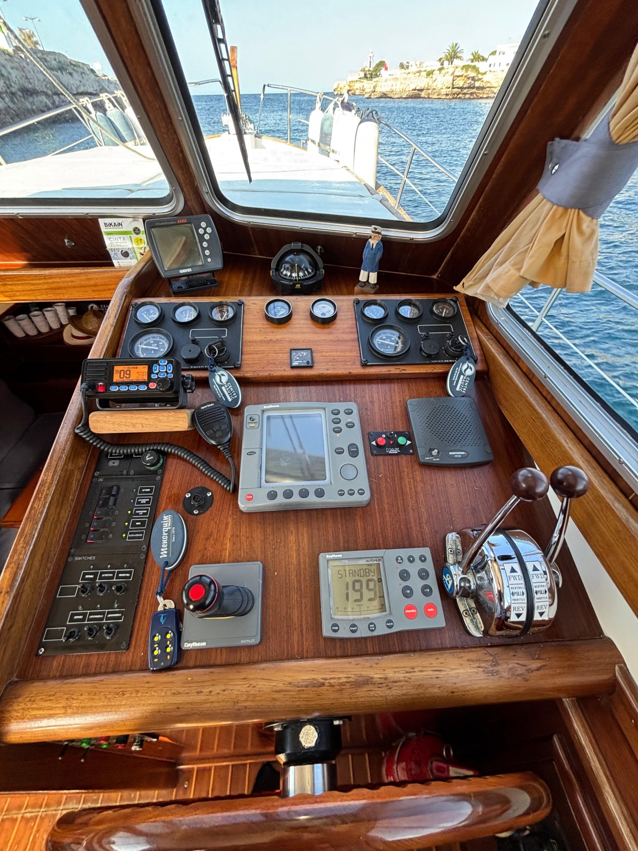 Este Menorquín destaca por su amplio espacio exterior, una bañera cómoda y protegida, pasillos generosos y una cubierta solarium perfecta para relajarse. Su interior, luminoso y bien distribuido, ofrece la calidez de la carpintería clásica y todas las comodidades necesarias para disfrutar de varios días a bordo.