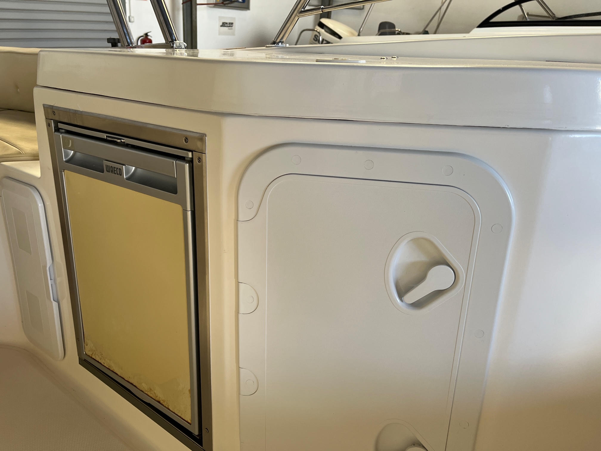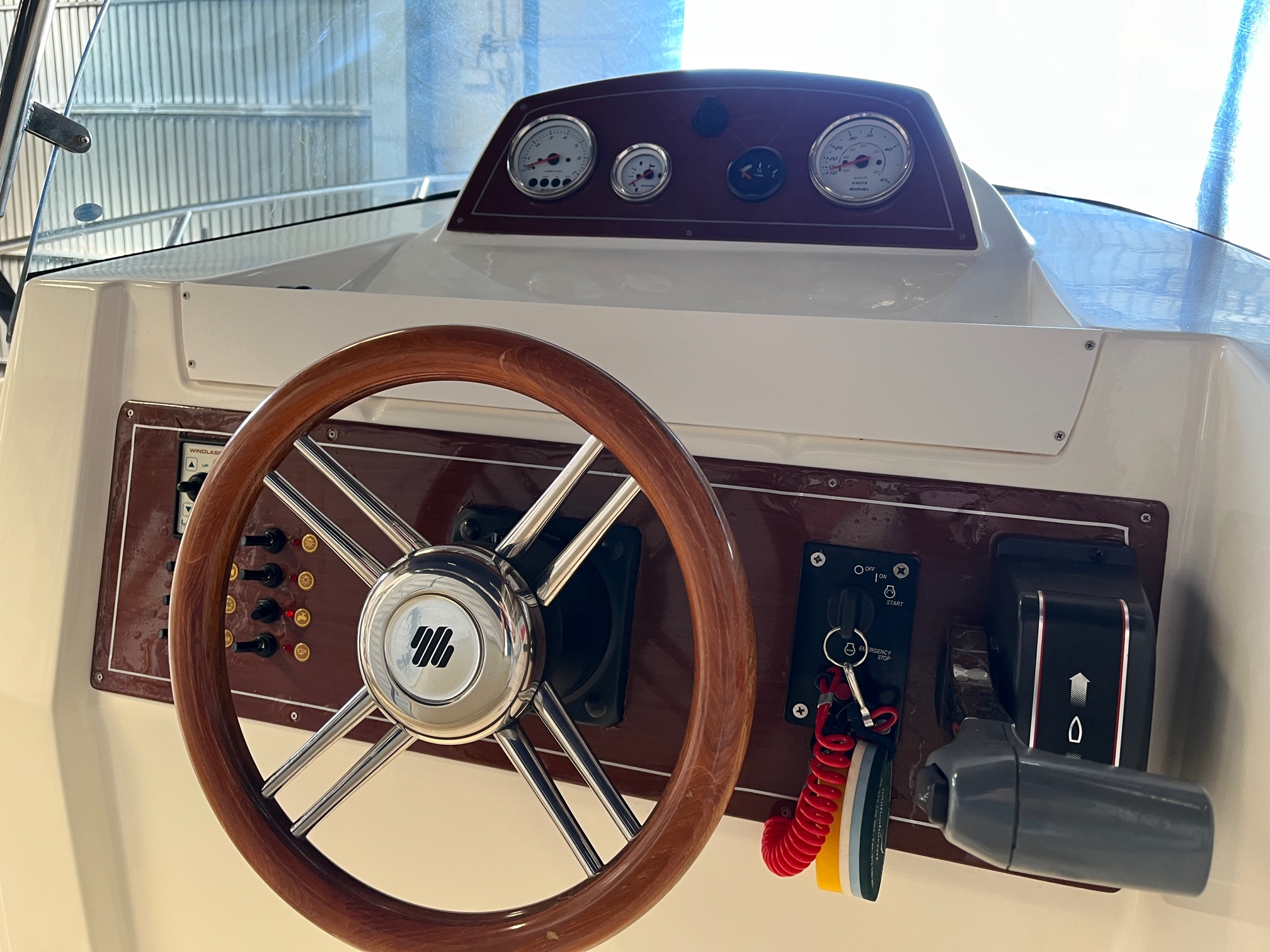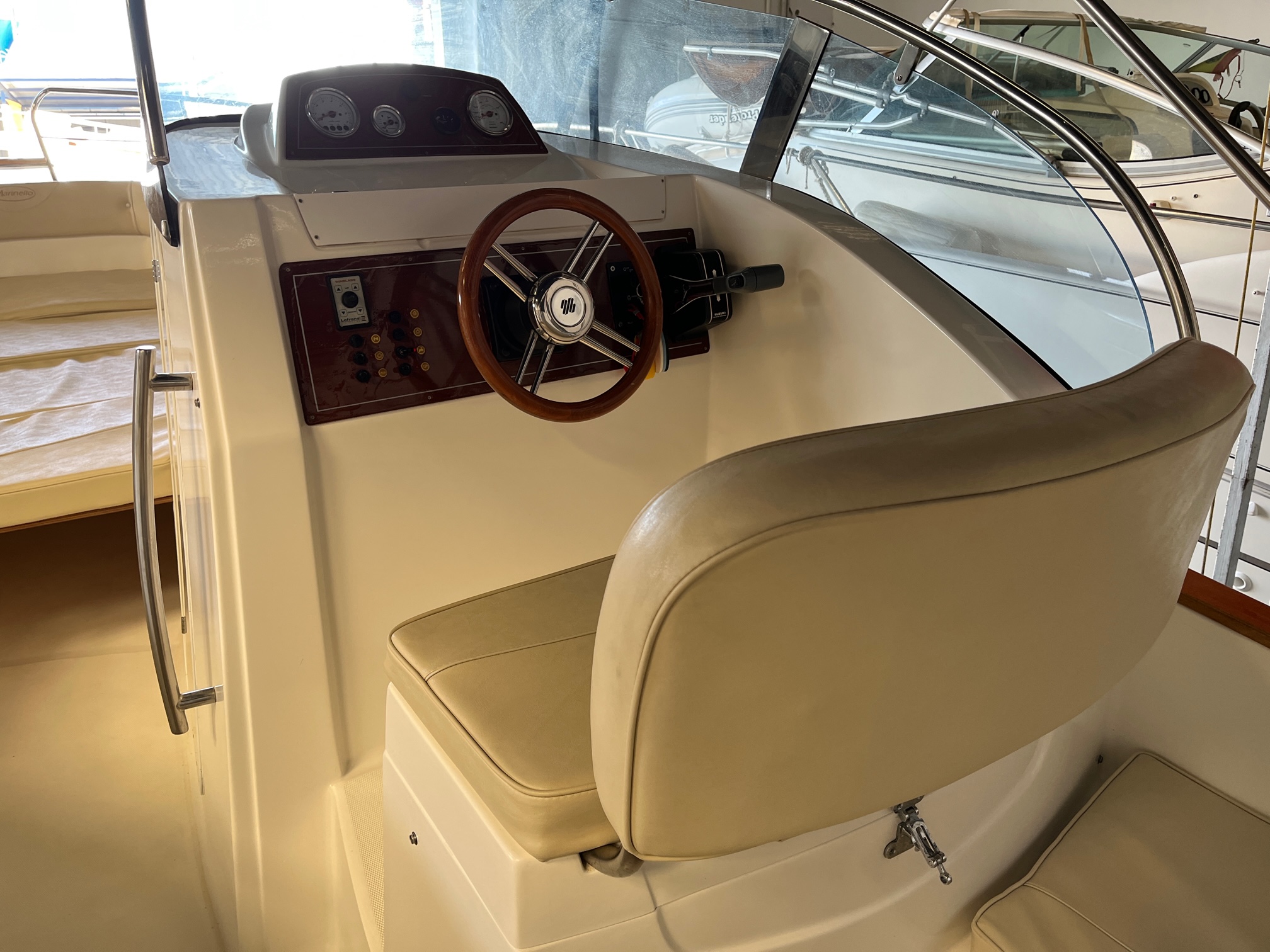 Embarcación en muy buen estado, con una distribución ideal para las salidas diarias, con varios espacios para el relax, zona de comedor convertible en solarium, además de un mueble auxiliar con cocina y nevera exterior que aumenta el confort y la versatilidad a bordo. Cuenta también con un WC muy conveniente, así como un buen equipamiento. Colchonetas completas, comedor popa convertible en solarium, gran toldo parasol inox, mueble con cocina y nevera eléctrica, fregadero, varios cofres estiba, mástil ski, mesa.