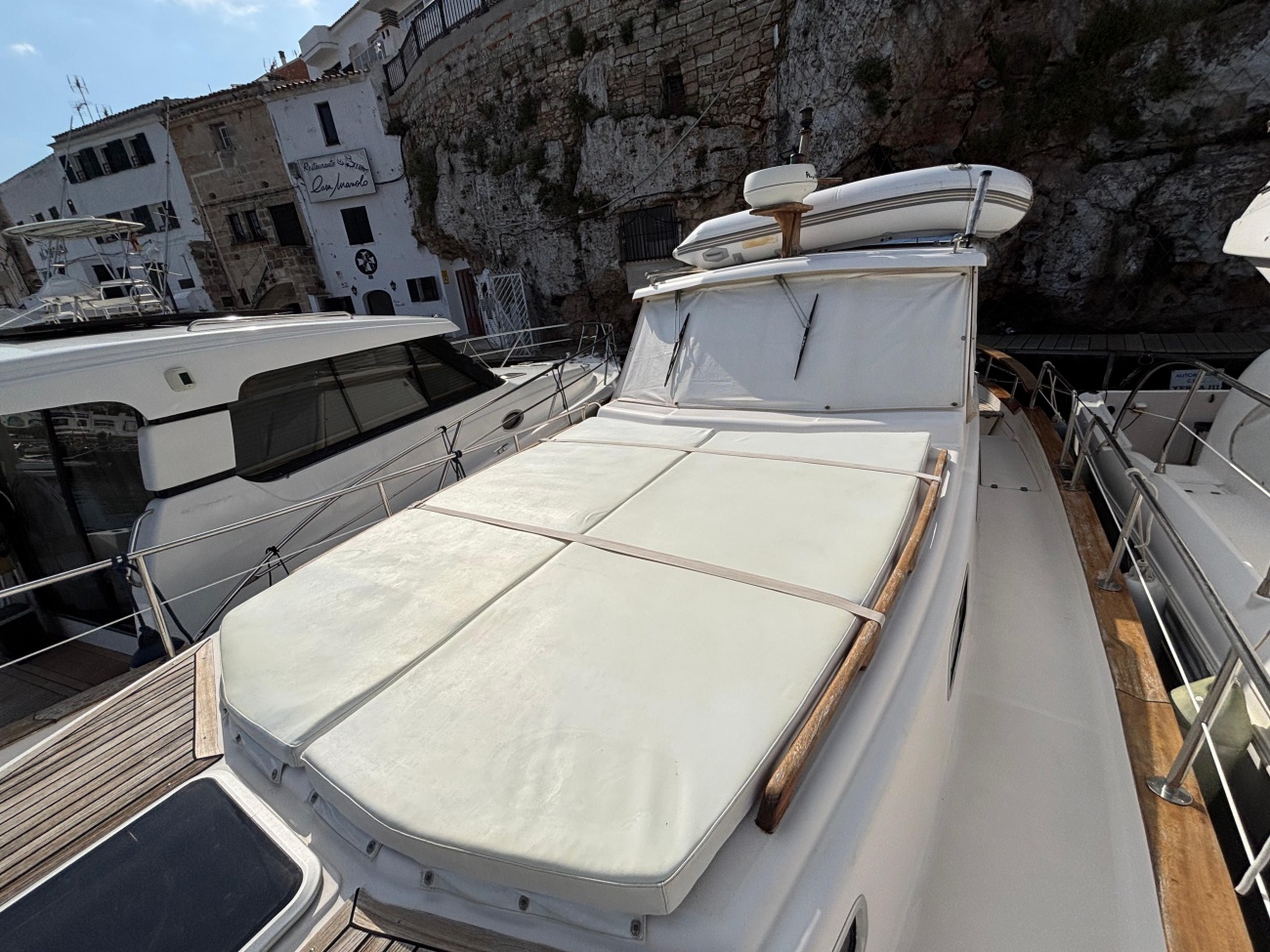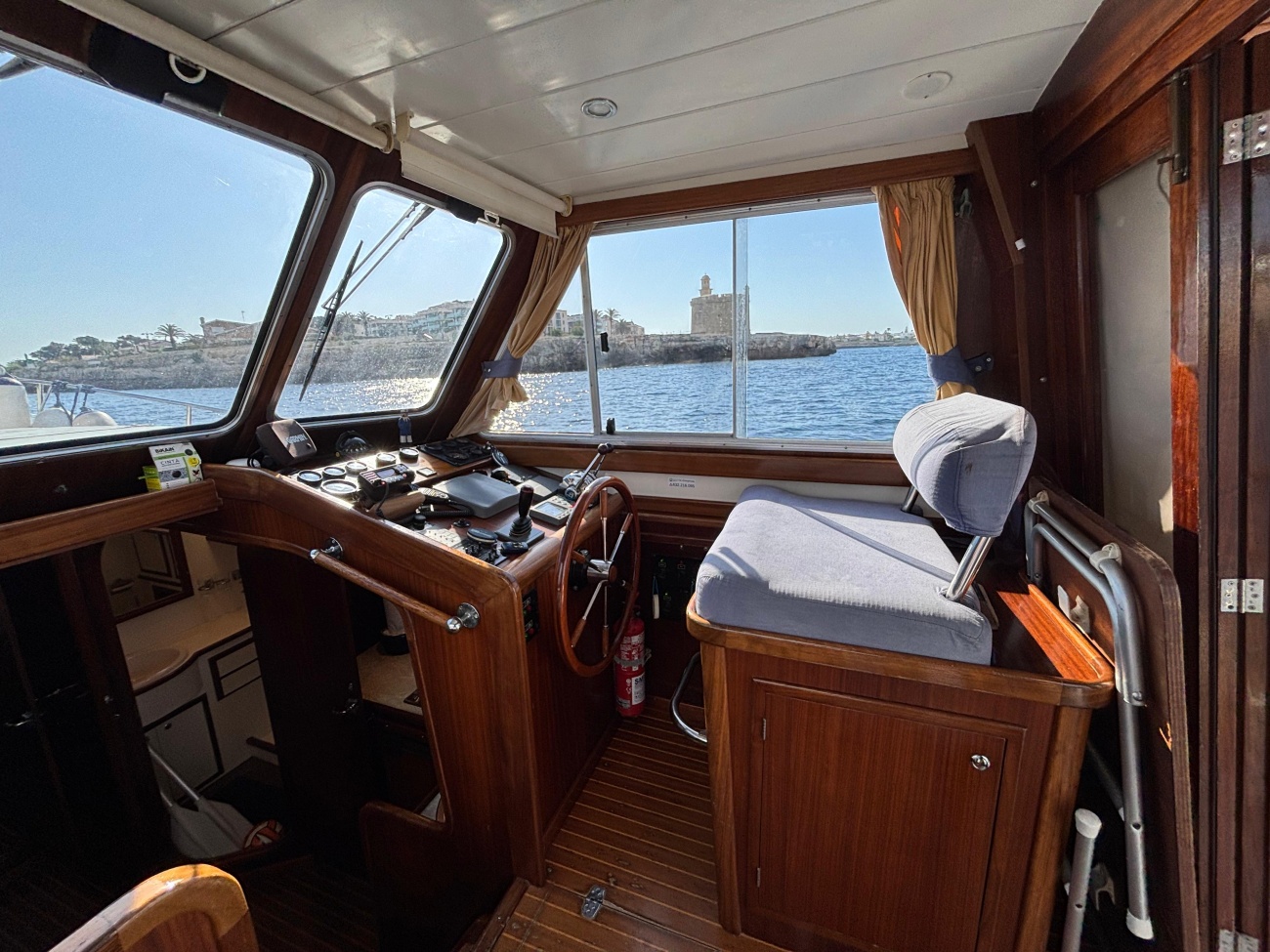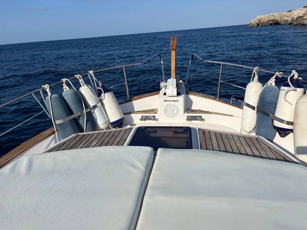 Este Menorquín destaca por su amplio espacio exterior, una bañera cómoda y protegida, pasillos generosos y una cubierta solarium perfecta para relajarse. Su interior, luminoso y bien distribuido, ofrece la calidez de la carpintería clásica y todas las comodidades necesarias para disfrutar de varios días a bordo.