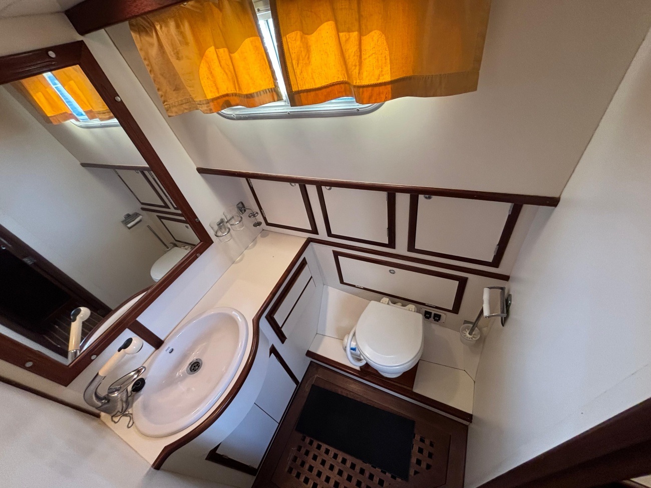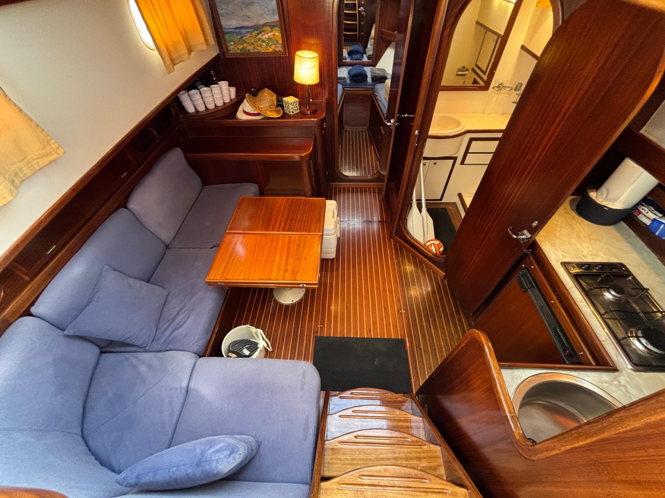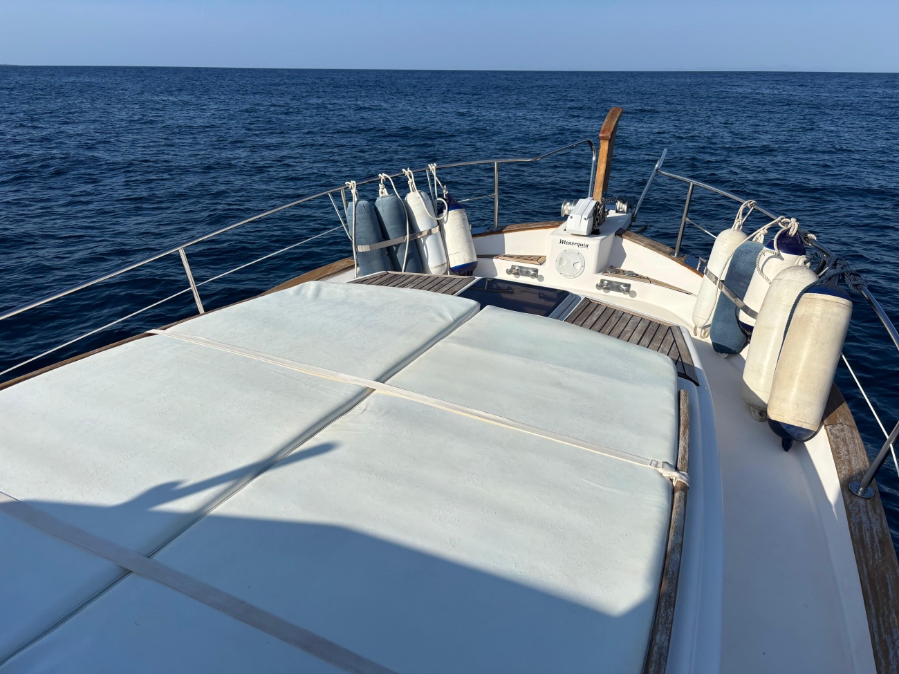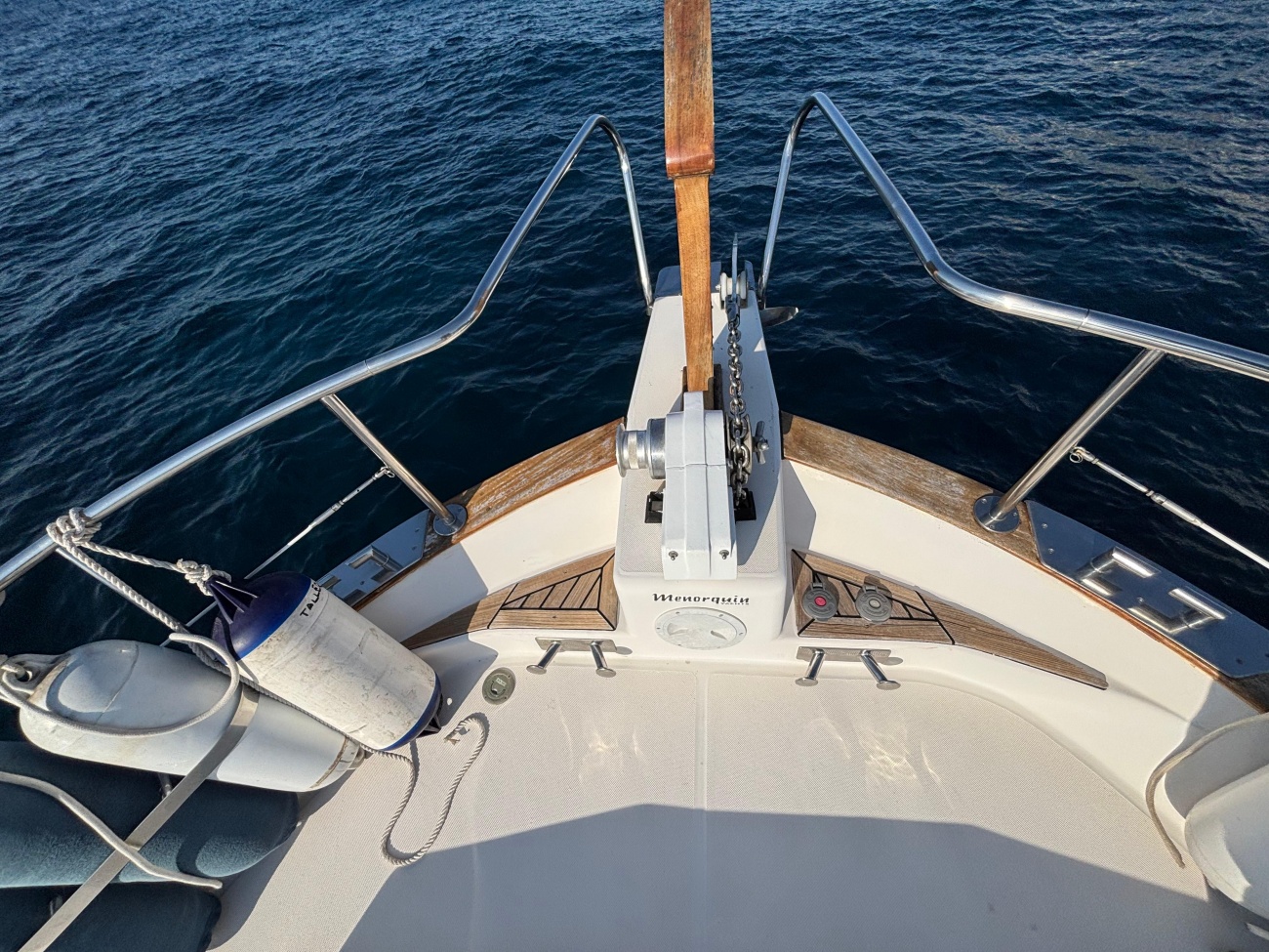 Este Menorquín destaca por su amplio espacio exterior, una bañera cómoda y protegida, pasillos generosos y una cubierta solarium perfecta para relajarse. Su interior, luminoso y bien distribuido, ofrece la calidez de la carpintería clásica y todas las comodidades necesarias para disfrutar de varios días a bordo.