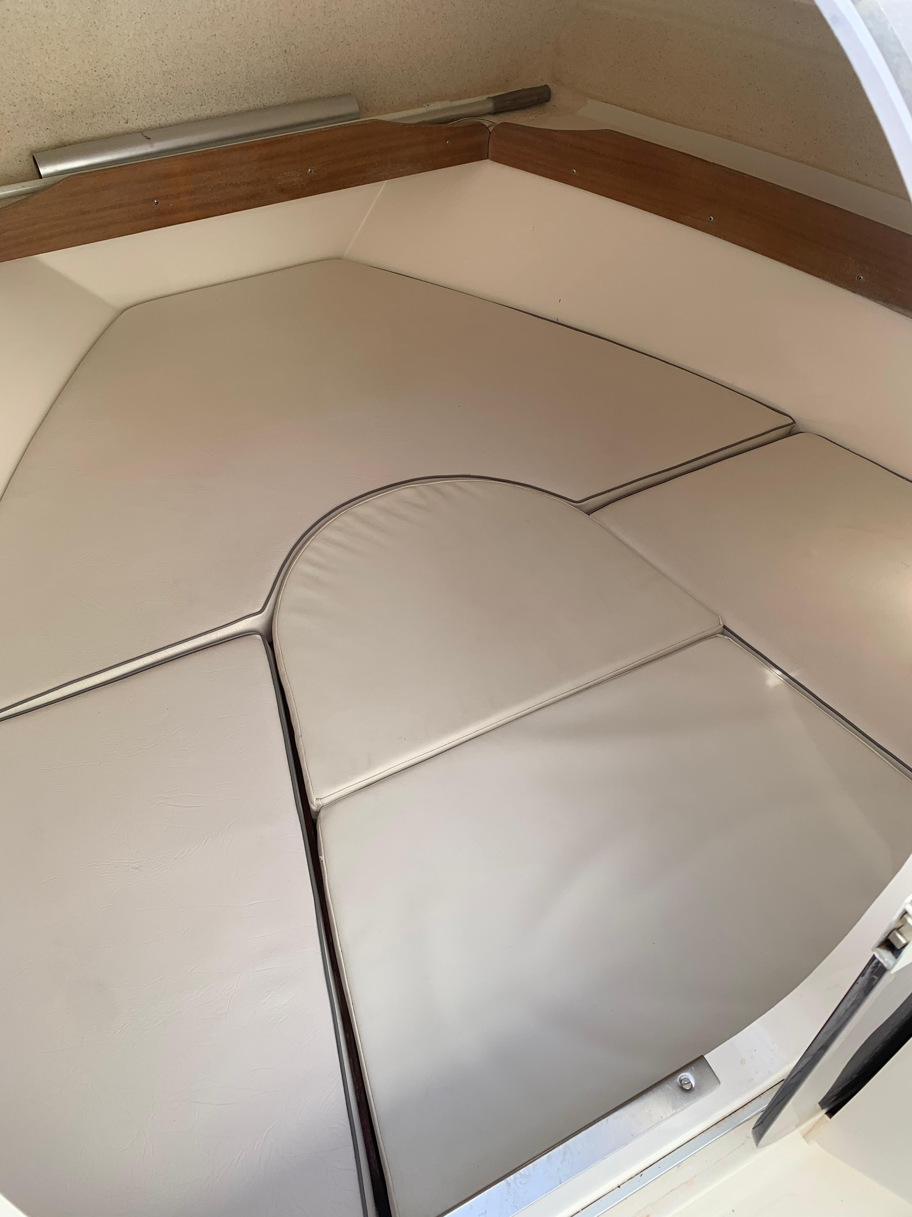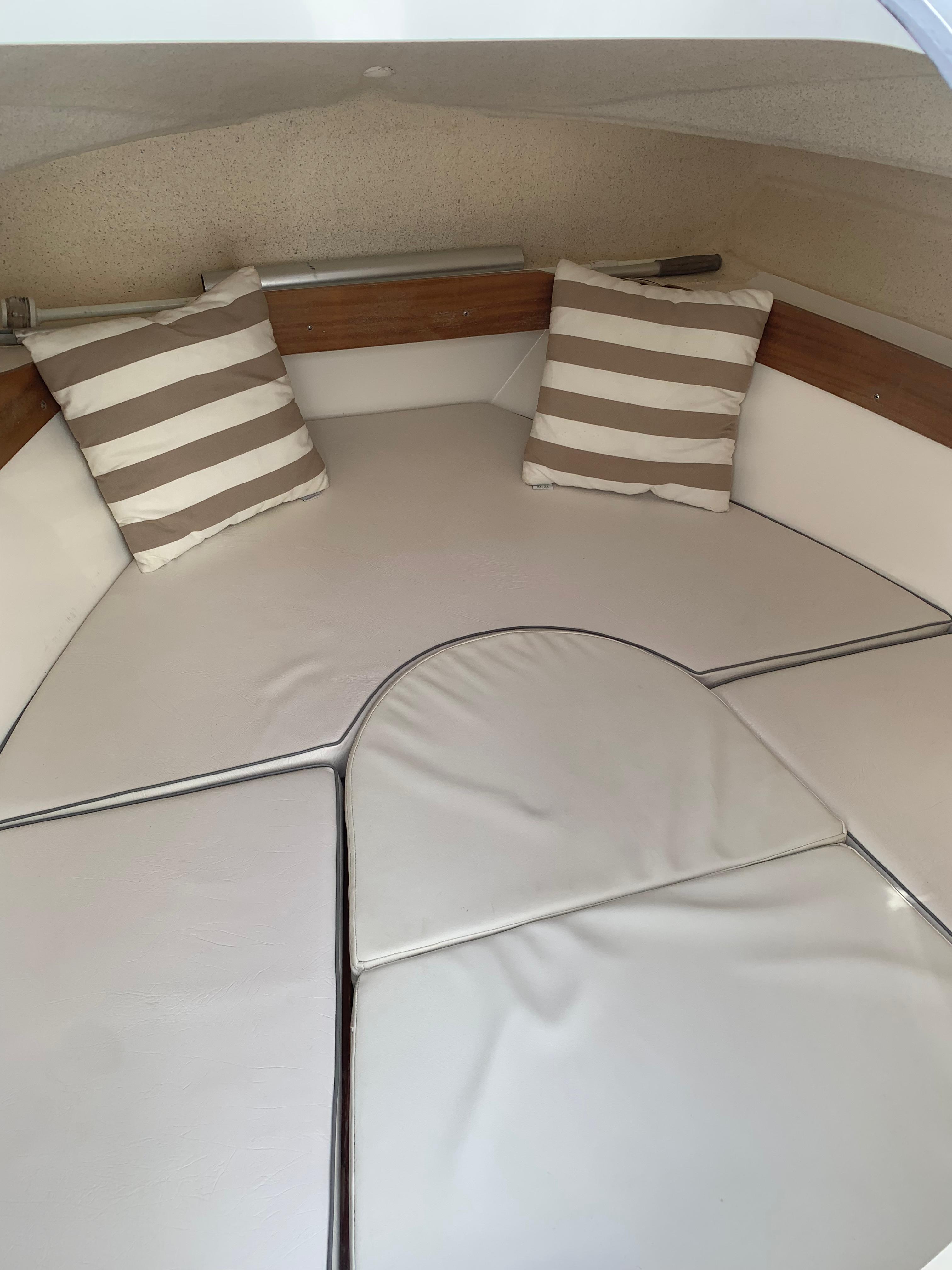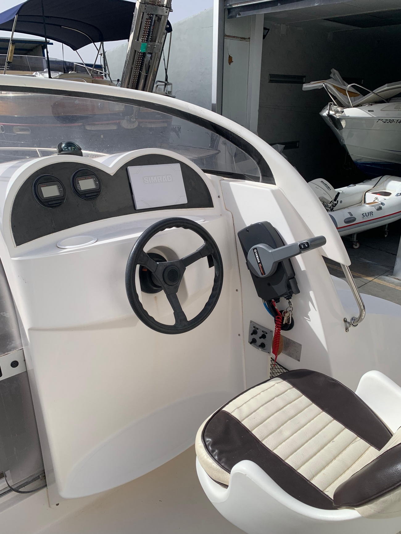 Barco equipado con colchonetas traseras, mesa en bañera, toldo parasol en popa, lona completa embarcación, cama doble interior con mesa, equipo de fondeo manual, equipo de seguridad, apto para 6 personas, SONDA GPS SIMRAD GO 07 - 2023. Al ser inferior de 6 mts, no pasa ITB y se puede llevar con Licencia de Navegación. Ducha en bañera. Disponible para ver en nuestras instalaciones de Ciutadella de Menorca, previa cita.